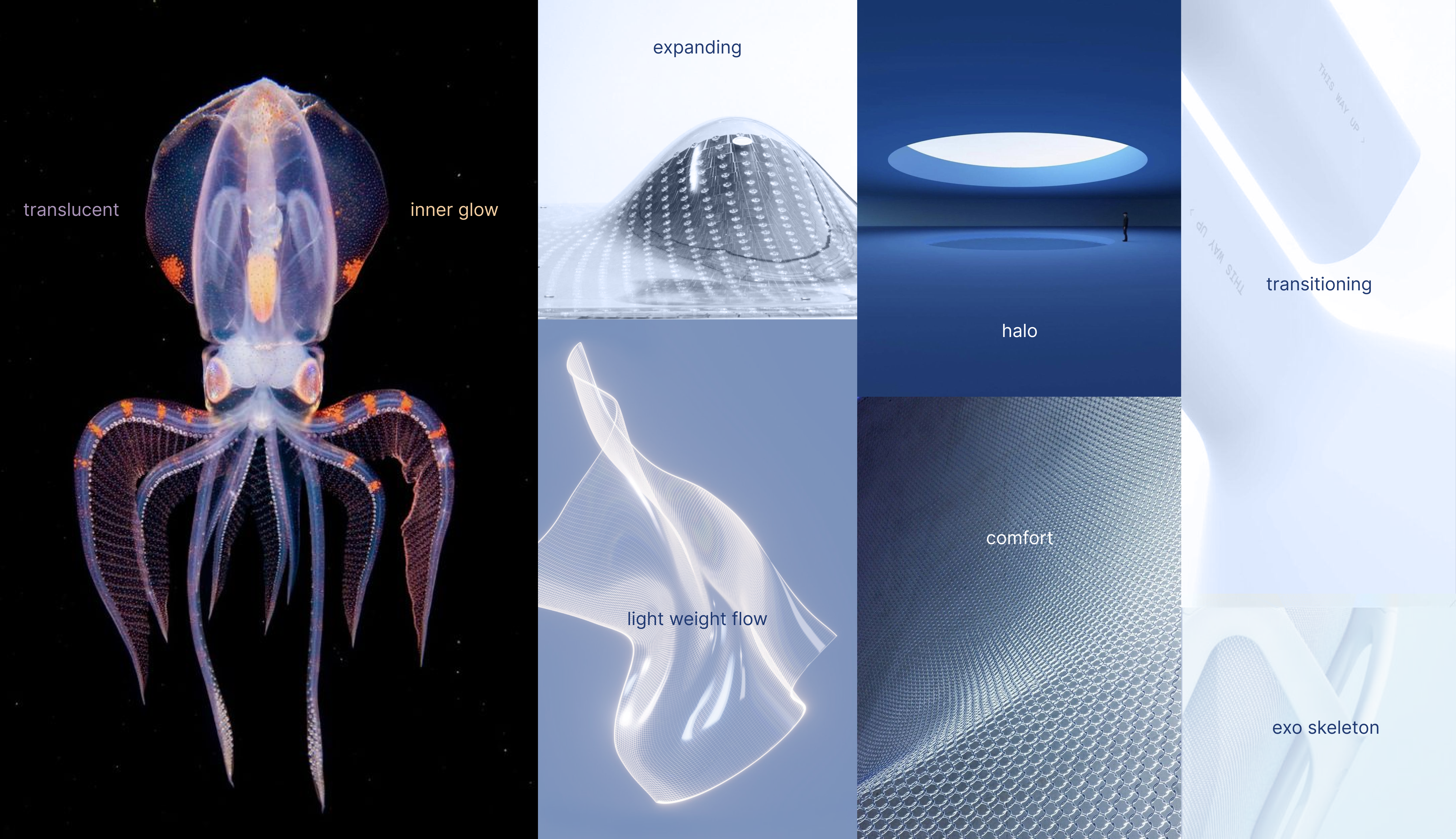 The design is inspired by deep-sea organisms to create a vehicle architecture that blends translucent skins with lightweight structures and a bioluminescent glow. The goal was to create a volume that almost dissolves against the sky and feels weightless despite its impressive dimensions. A gondola is held central to the main volume and offers an open and comfortable travel experience with minimal boundaries to the environment. At night, a bioluminescent glow creates an energized feel and brings the aircraft to life.
