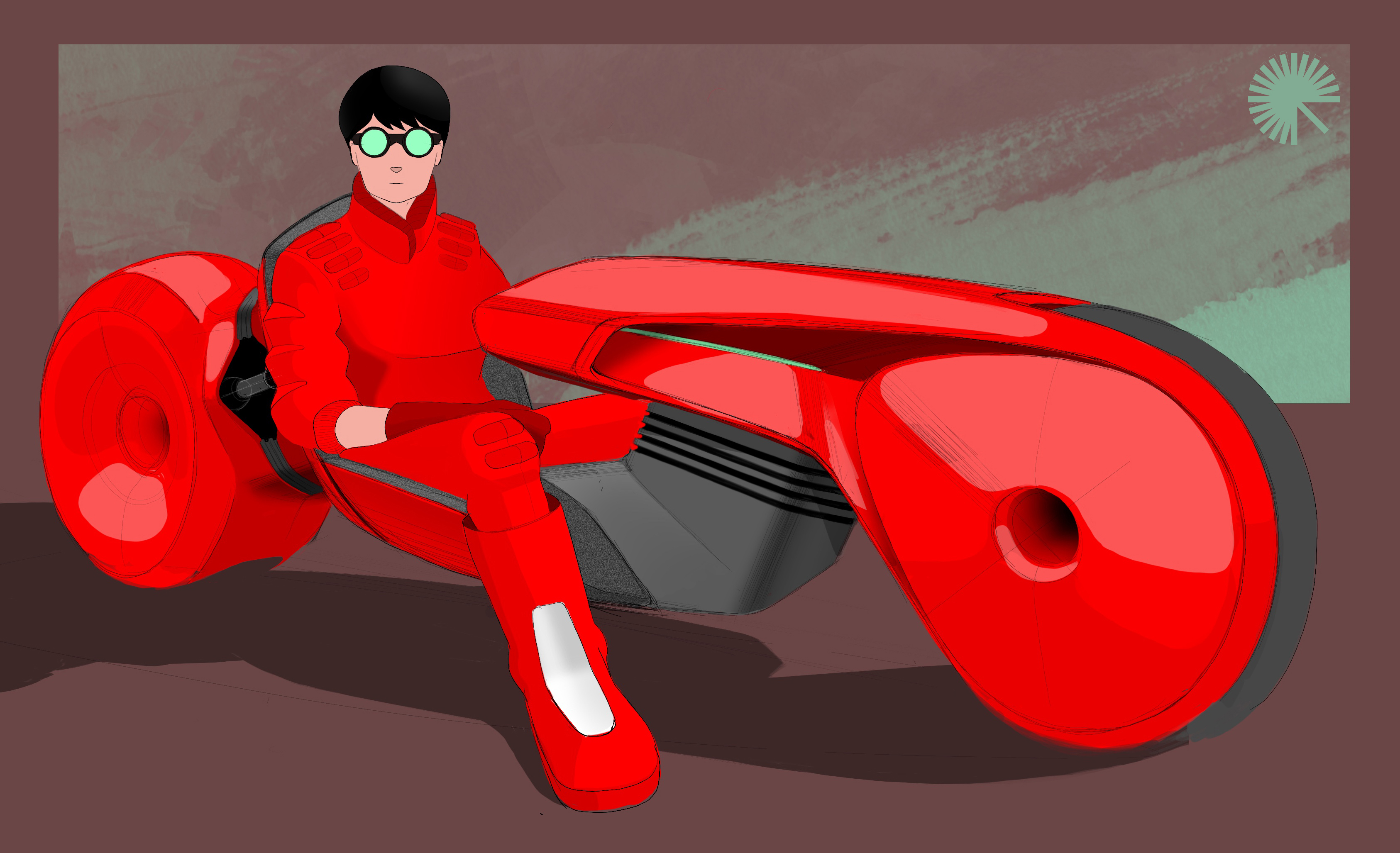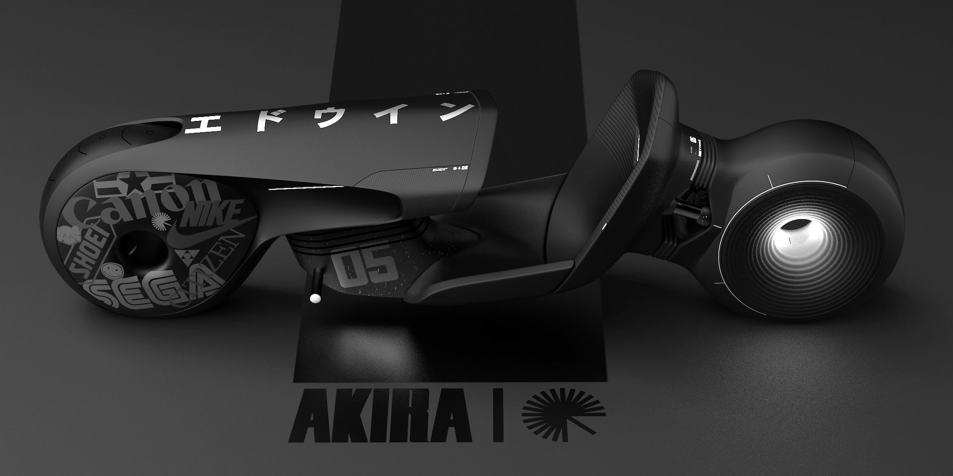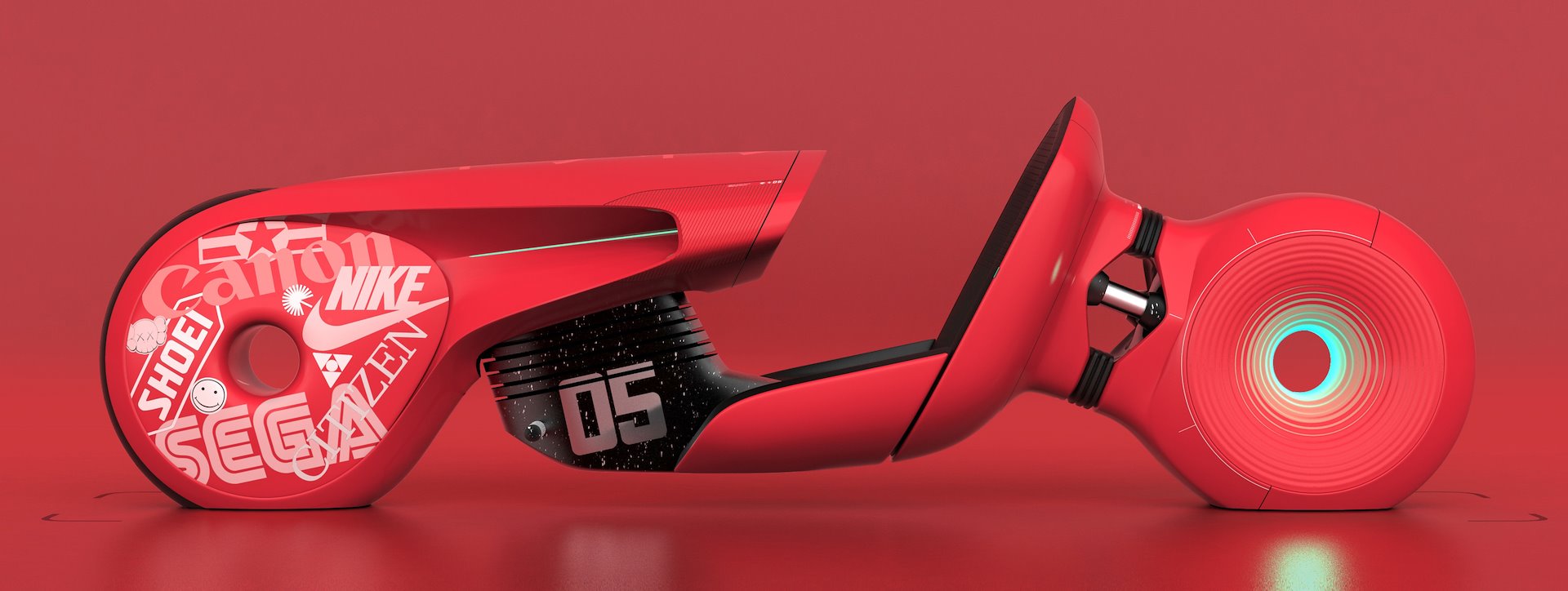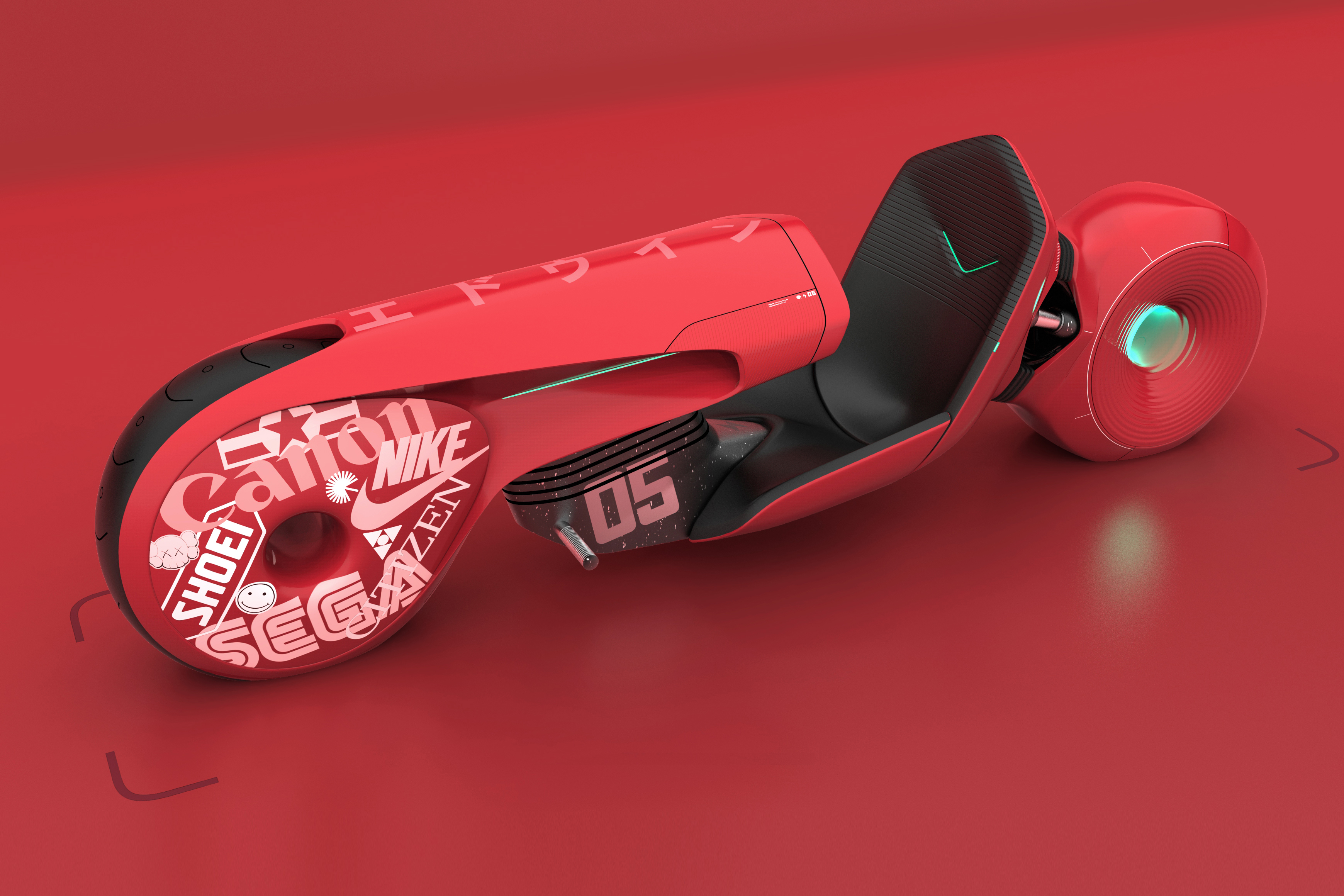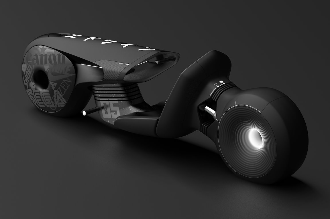Kaneda’s bike is an electric motorbike study based on the iconic film vehicle. An electromagnetic propulsion engine is centred at the rear wheel where a halo glow amplifies the infinite thrust of the motor. The sculptural expression is kept to a minimum to create a clean canvas for the bold sticker application based on the original design.