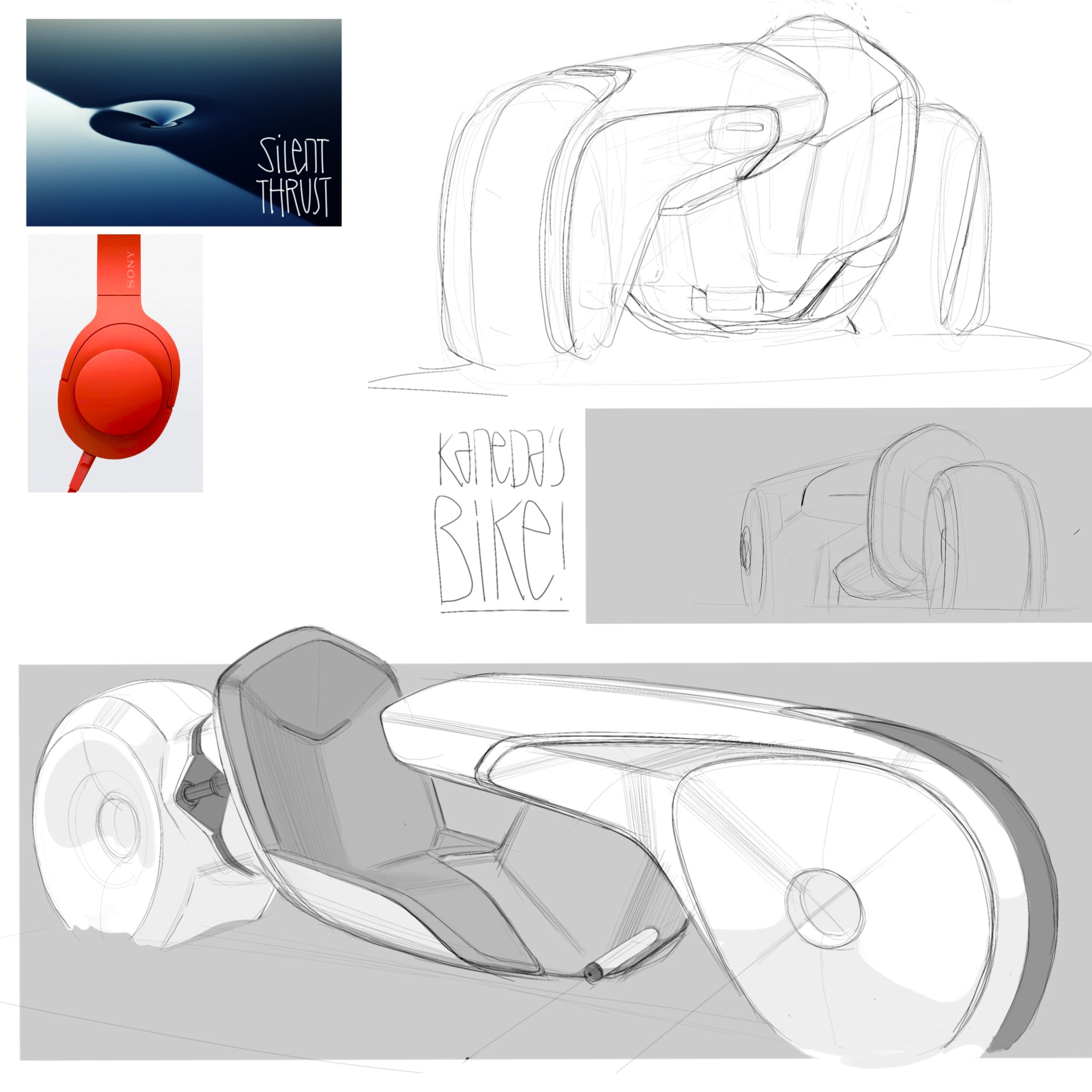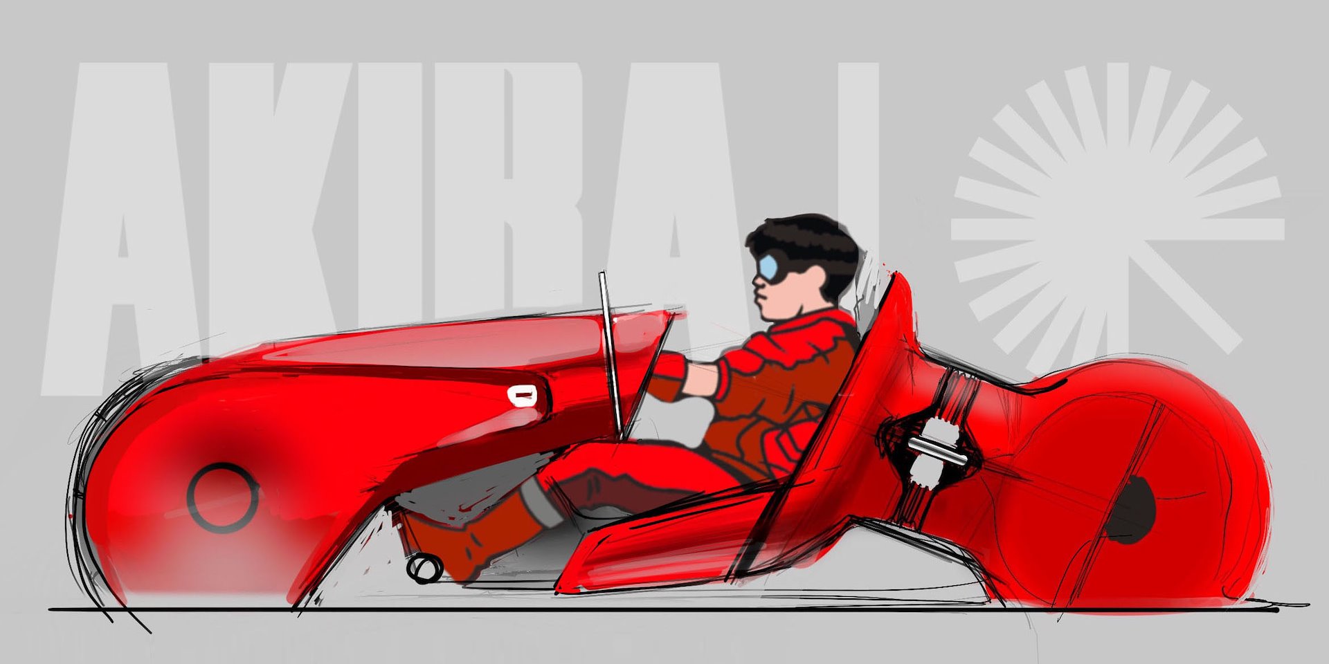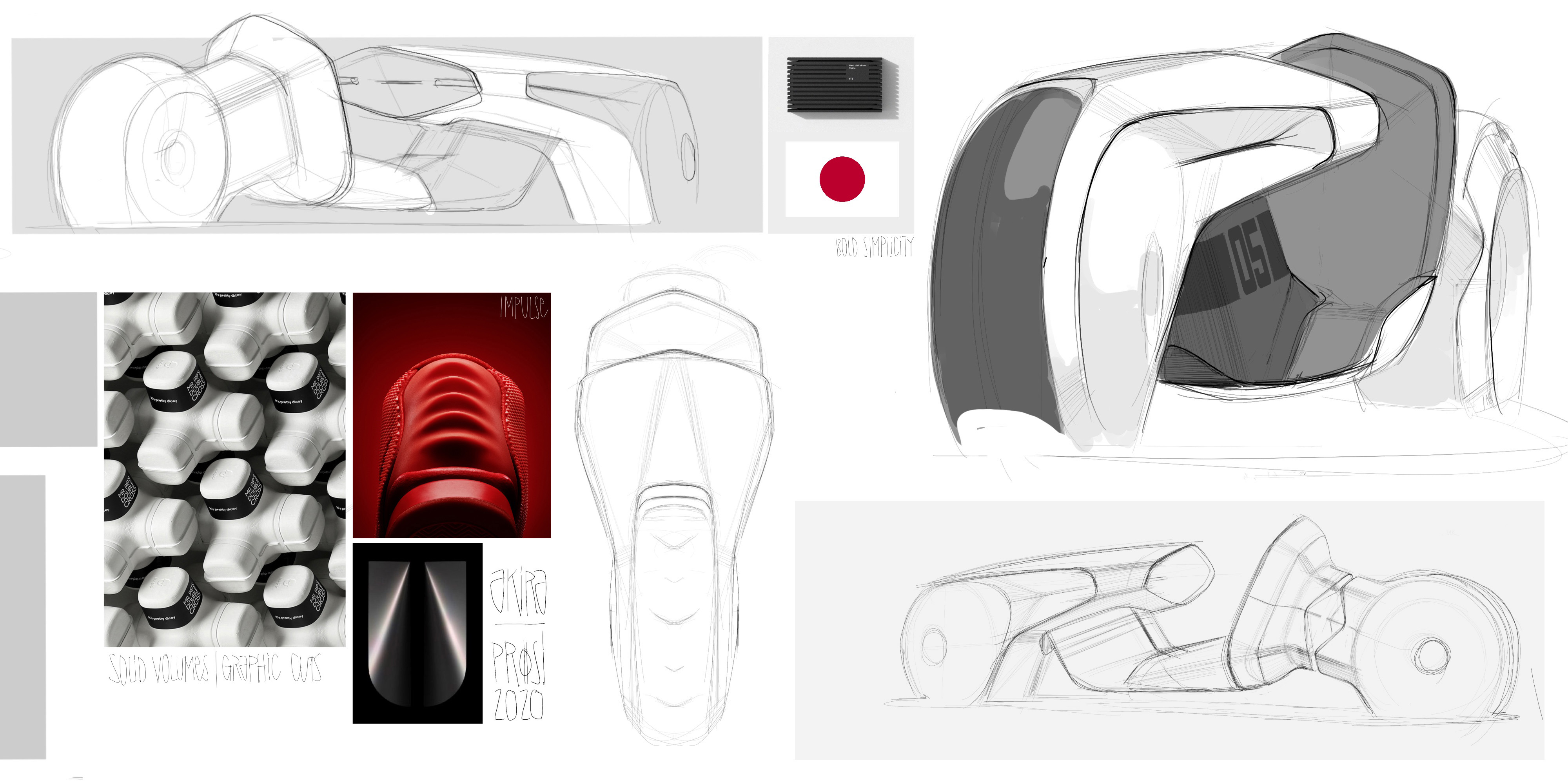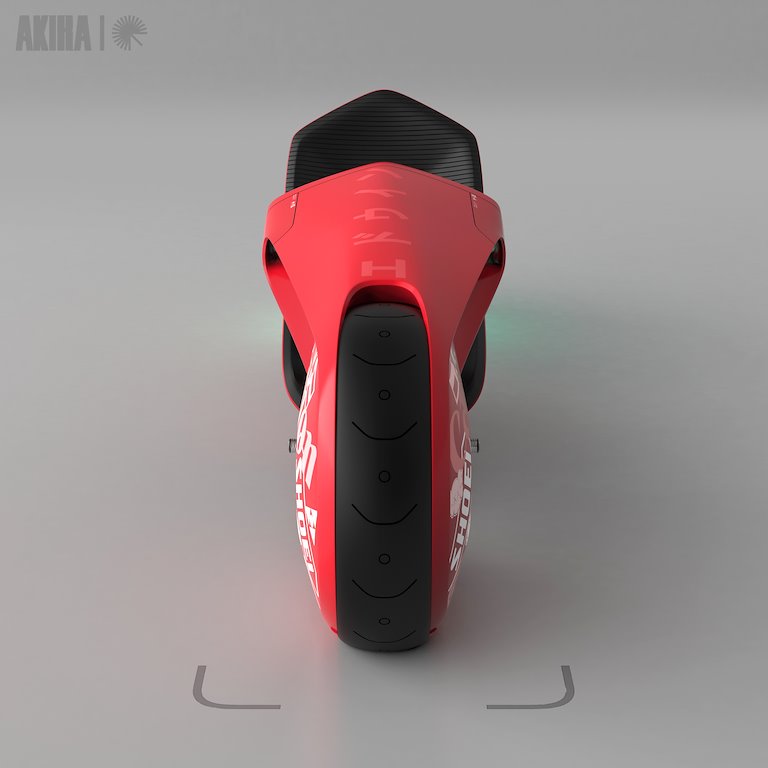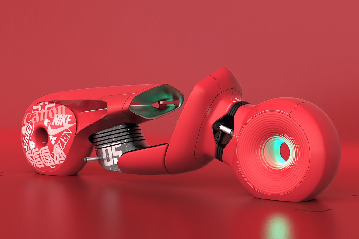 Kaneda’s bike is an electric motorbike study based on the iconic film vehicle. An electromagnetic propulsion engine is centred at the rear wheel where a halo glow amplifies the infinite thrust of the motor. The sculptural expression is kept to a minimum to create a clean canvas for the bold sticker application based on the original design.